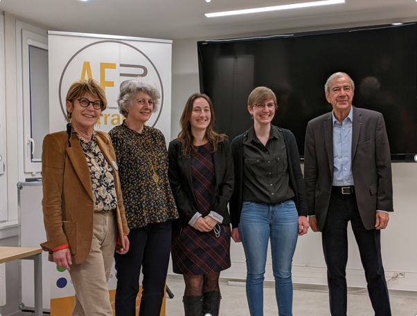 De gauche à droite : Catherine Thuet (Présidente de l’AFFDU Lorraine), Clotilde Boulanger (VP déléguée Stratégie doctorale de l’UL) Charlotte Maillot, Justine Noël et Paul Arker (Président de l’AMESTE)
